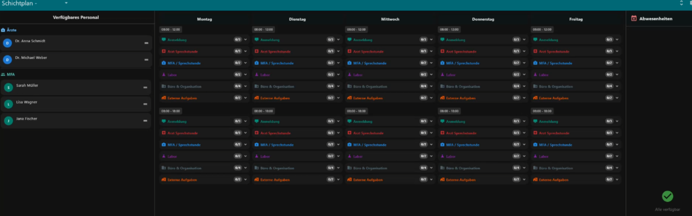 Unser Fokus liegt dabei auf User Experience (UX): Wie im utenstehenden Dashboard für das Ressourcenmanagement zu sehen, entwicklen wir Interfaces, die Daten nicht nur anzeigen, sondern Arbeitsabläufe beschleunigen. Ob Drag-and-Drop-Logik, Echtzeit-Updates oder Dark-Mode – wir bauen Software, die Ihre Nutzer gerne verwenden.
